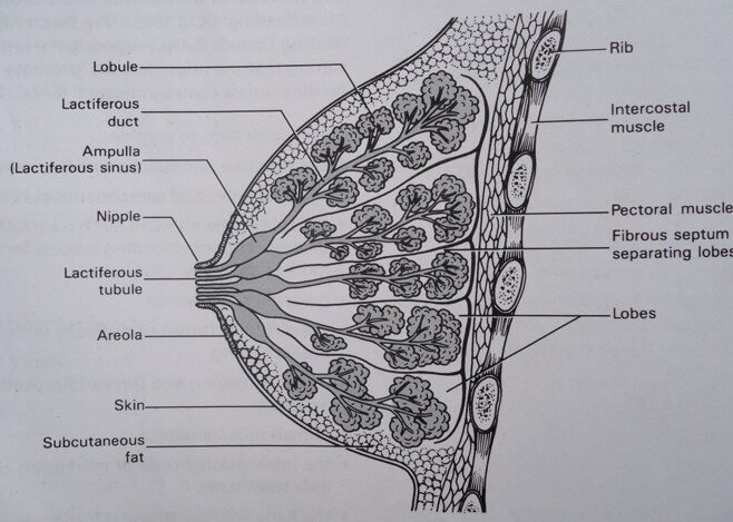 The breast has an internal structure resembling a “cut orange.” It is mainly composed of glandular tissues surrounded by a pad of fatty tissue beneath the skin. The glandular tissue is divided into 18–20 lobes by fibrous tissue, with each lobe functioning as a self-contained unit.
