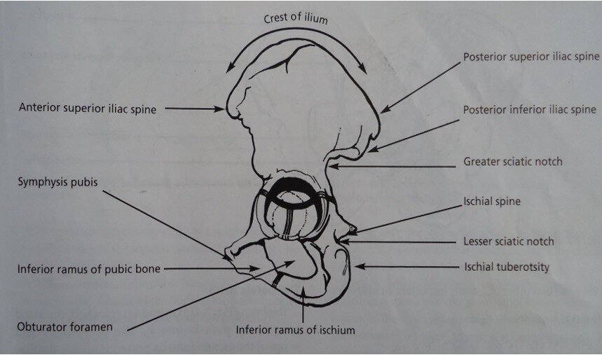 - Laterally: The greater sciatic notch, the back of the acetabulum, the obturator foramen, the back of the body of the pubic bone.