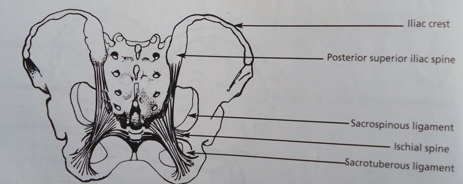 (2) Sacrospinous ligament: They are two in number running beneath the sacrotuberous ligament, extends from the lower border of the sacrum to the ischial spines.