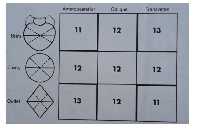 (i) ANTEROPOSTERIOR DIAMETER: It is measured from the lower border of the symphysis pubis to the sacrococcygeal joint. It measures 13 cm; the coccyx can tilt backwards during labor. This diameter includes the space available during delivery.