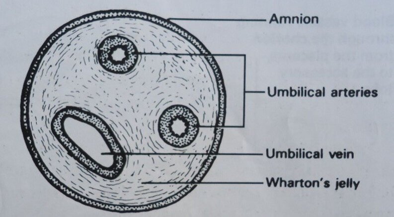 These vessels are enclosed and protected by Wharton’s jelly, a gelatinous substance formed from the mesoderm.