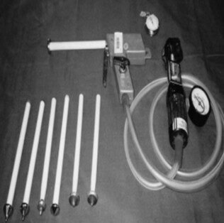 Uses cryoprobes, cryogun, pressure gauge, and stopwatch.