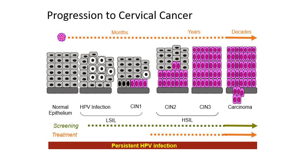 Persistent HPV infection leads to progression from LSIL (Low-grade Squamous Intraepithelial Lesion) to HSIL (High-grade Squamous Intraepithelial Lesion) and eventually carcinoma.